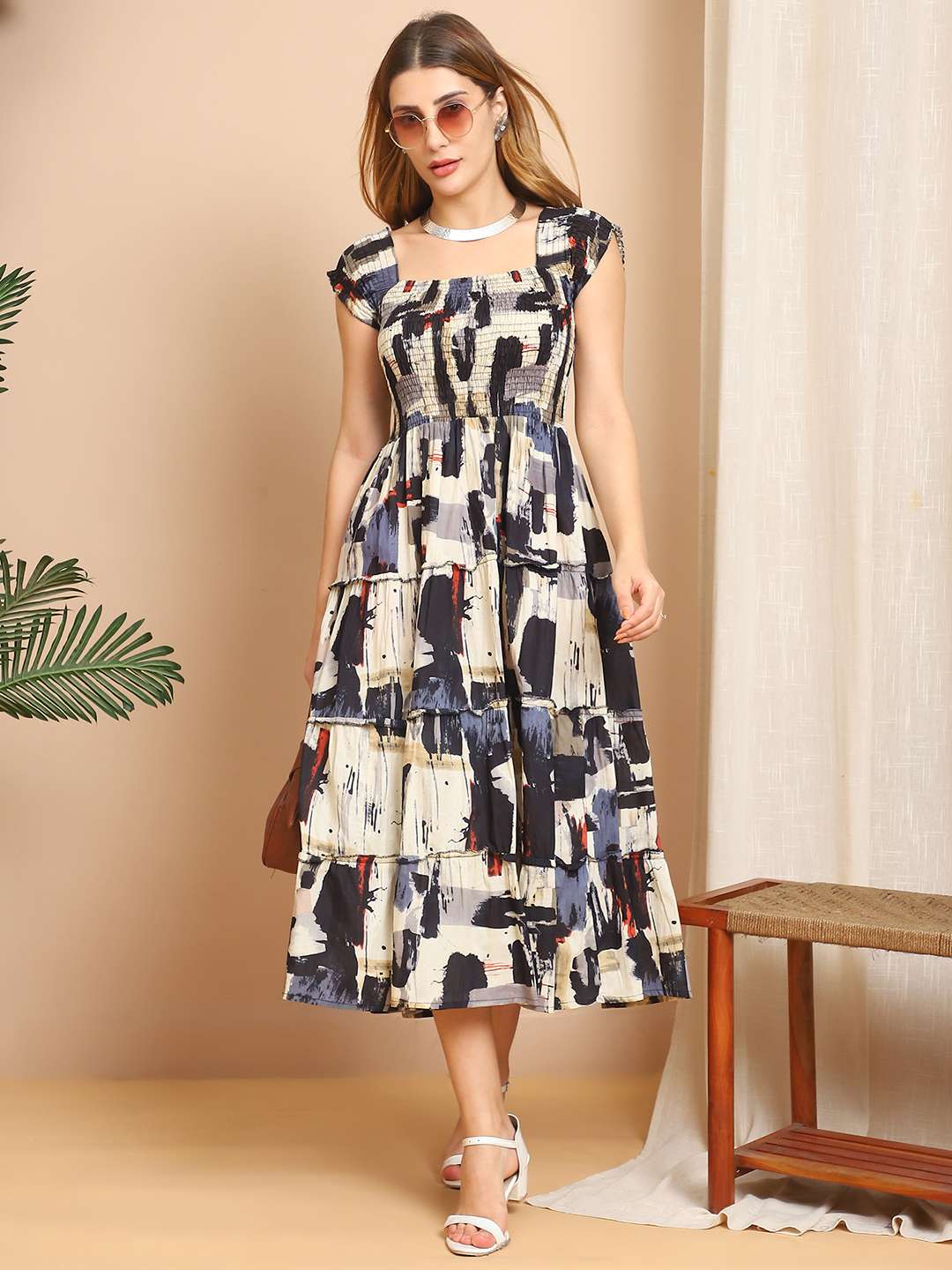 Women's Viscos Rayon Printed Off Shoulder Midi Dress For Summer And Casual Wear (Multti Color3)