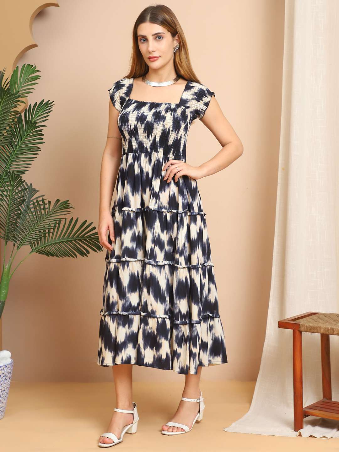Women's Viscos Rayon Printed Off Shoulder Midi Dress For Summer And Casual Wear