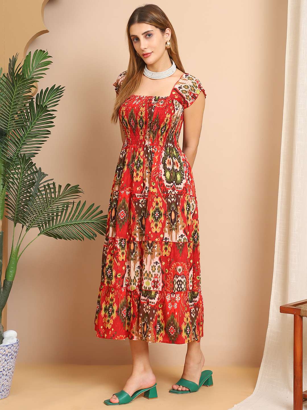 Women's Viscos Rayon Printed Off Shoulder Midi Dress For Summer And Casual Wear (Red)