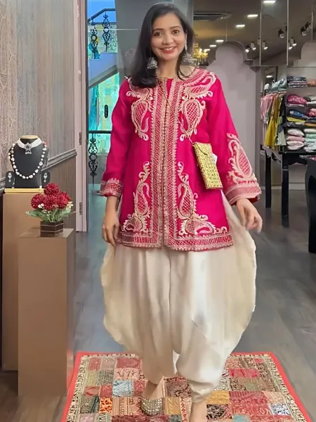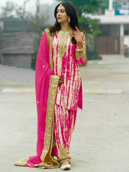 Pink Punjabi Dress in Chinon With Sequence Embroidery Work and Cream Dhoti
