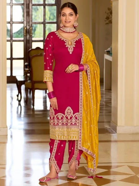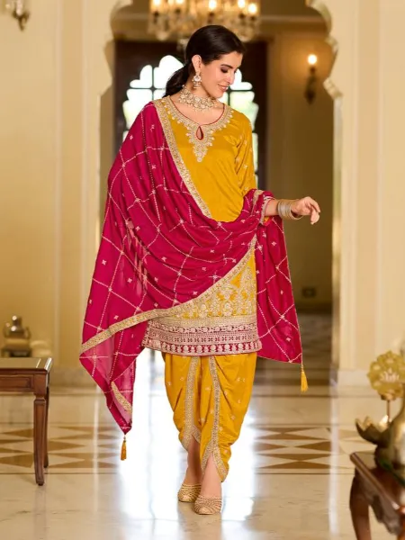 Pink and Yellow Patiyala Suit With Dhoti Sequence and Embroidery Work