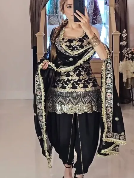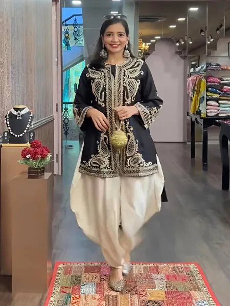 Black Punjabi Dress in Chinon With Sequence Embroidery Work and Cream Dhoti