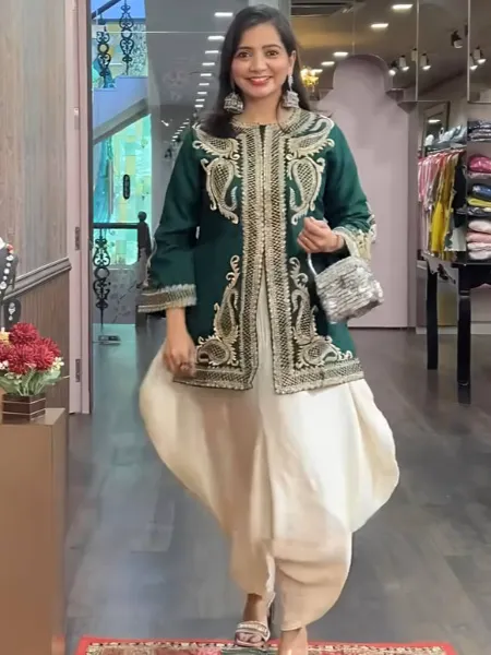 Green Punjabi Dress in Chinon With Sequence Embroidery Work and Cream Dhoti
