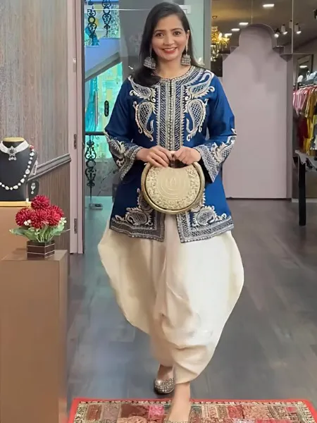 Blue Punjabi Dress in Chinon With Sequence Embroidery Work and Cream Dhoti