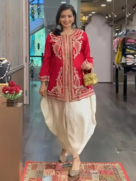 Red Punjabi Dress in Chinon With Sequence Embroidery Work and Cream Dhoti