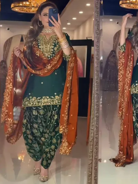 Green Punjabi Patiyala Dress in Chinon Silk With Dhoti and Sequence Work