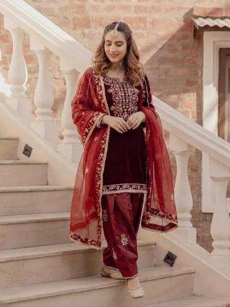 Maroon Velvet Kurta Patiyala Suit With Sequence Embroidery Winter Dress