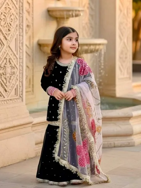 Black Kids Kurta and Sharara in Velvet With Sequence Embroidery and Dupatta