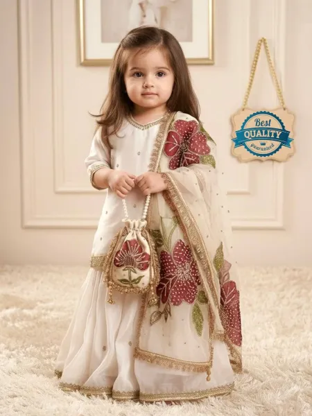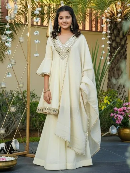 Cream Kids Kurta and Sharara in Silk With Embroidery and Real Mirror Kids Dress