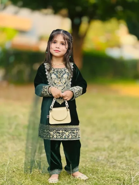 Green Kids Kurta and Pant in Velvet With Sequence Embroidery and Dupatta