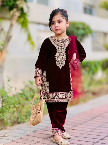 Maroon Kids Kurta and Pant in Velvet With Sequence Embroidery and Dupatta