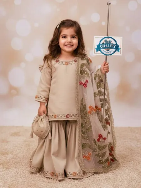 Beige Kids Kurta and Sharara in Jimmy Choo With Sequins Embroidery and Kids Dress