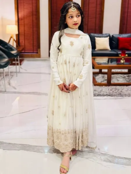 Kids Gown With Sequins Embroidery in White Vichitra Silk With Dupatta