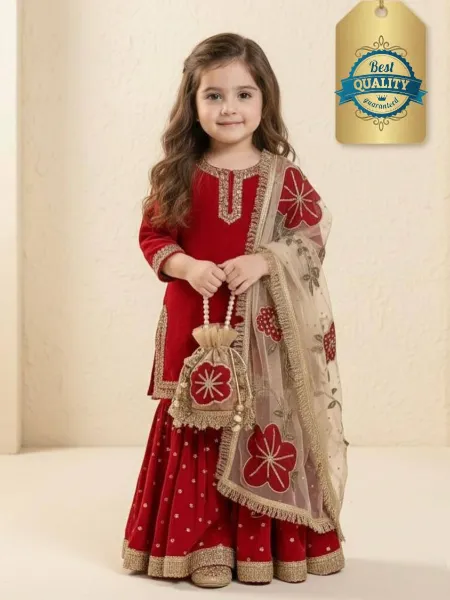 Maroon Kids Kurta and Sharara in Fendi Silk With Sequins Embroidery and Kids Dress