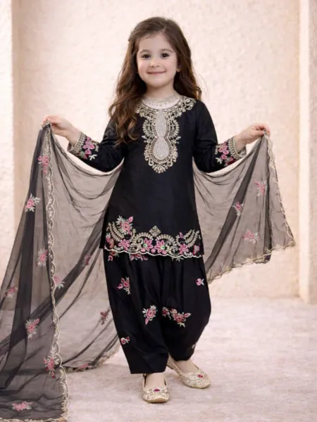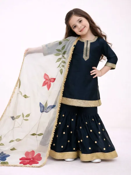Black Kids Kurta and Sharara in Jimmy Choo Silk With Sequins Embroidery Kids Dress