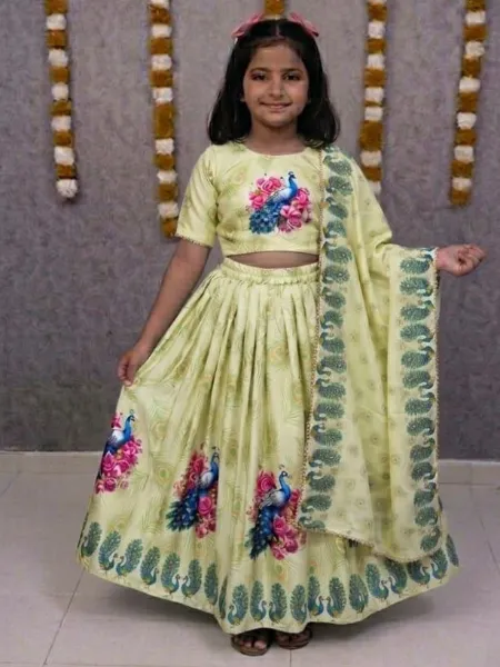 Cream Kids Lehenga Choli in Tweel Cotton With Beautiful Peacock Print