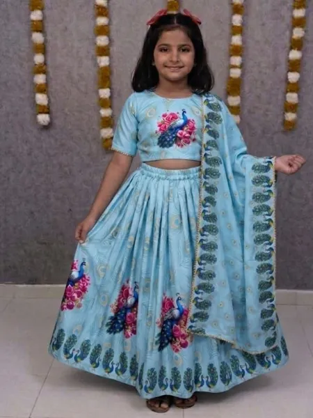 Sky Blue Kids Lehenga Choli in Tweel Cotton With Beautiful Peacock Print