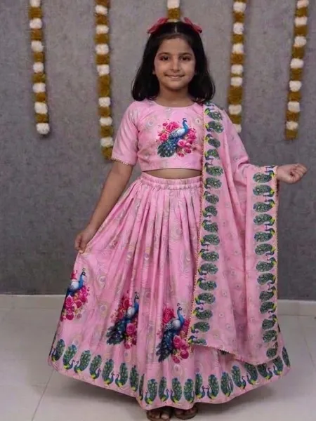 Baby Pink Kids Lehenga Choli in Tweel Cotton With Beautiful Peacock Print