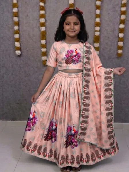 Peach Kids Lehenga Choli in Tweel Cotton With Beautiful Peacock Print
