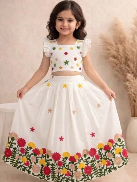 White Kids Floral Soft Printed Work Lehenga Choli Kids Wear