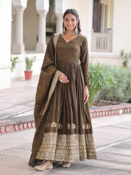 Mehendi Anarkali Dress in Vichitra Silk With Sequence Embroidery and Dupatta