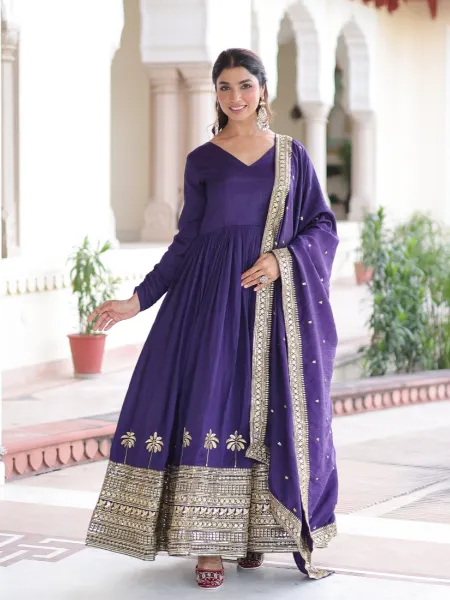 Purple Anarkali Dress in Vichitra Silk With Sequence Embroidery and Dupatta