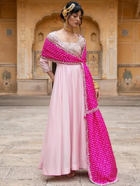 Pink Anarkali Dress in Roman Silk With Sequins Embroidery and Dupatta