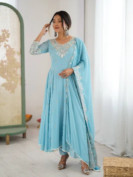 Sky Color Anarkali in Georgette With Rainbow Sequence Embroidery and Dupatta