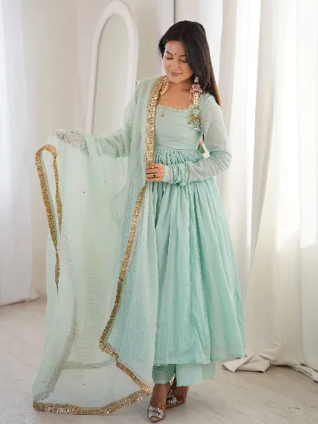 Pale Cyan Anarkali in Georgette With Real Mirror Lace and Dupatta