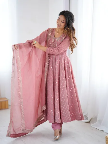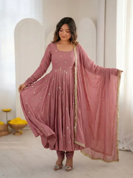 Dusty Pink Anarkali Suit With Sequence Embroidery and Dupatta in Roman Silk