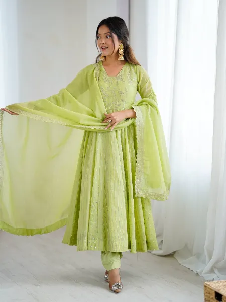 Parrot Crunchy Silk Anarkali Suit With Sequence Embroidery Work and Dupatta