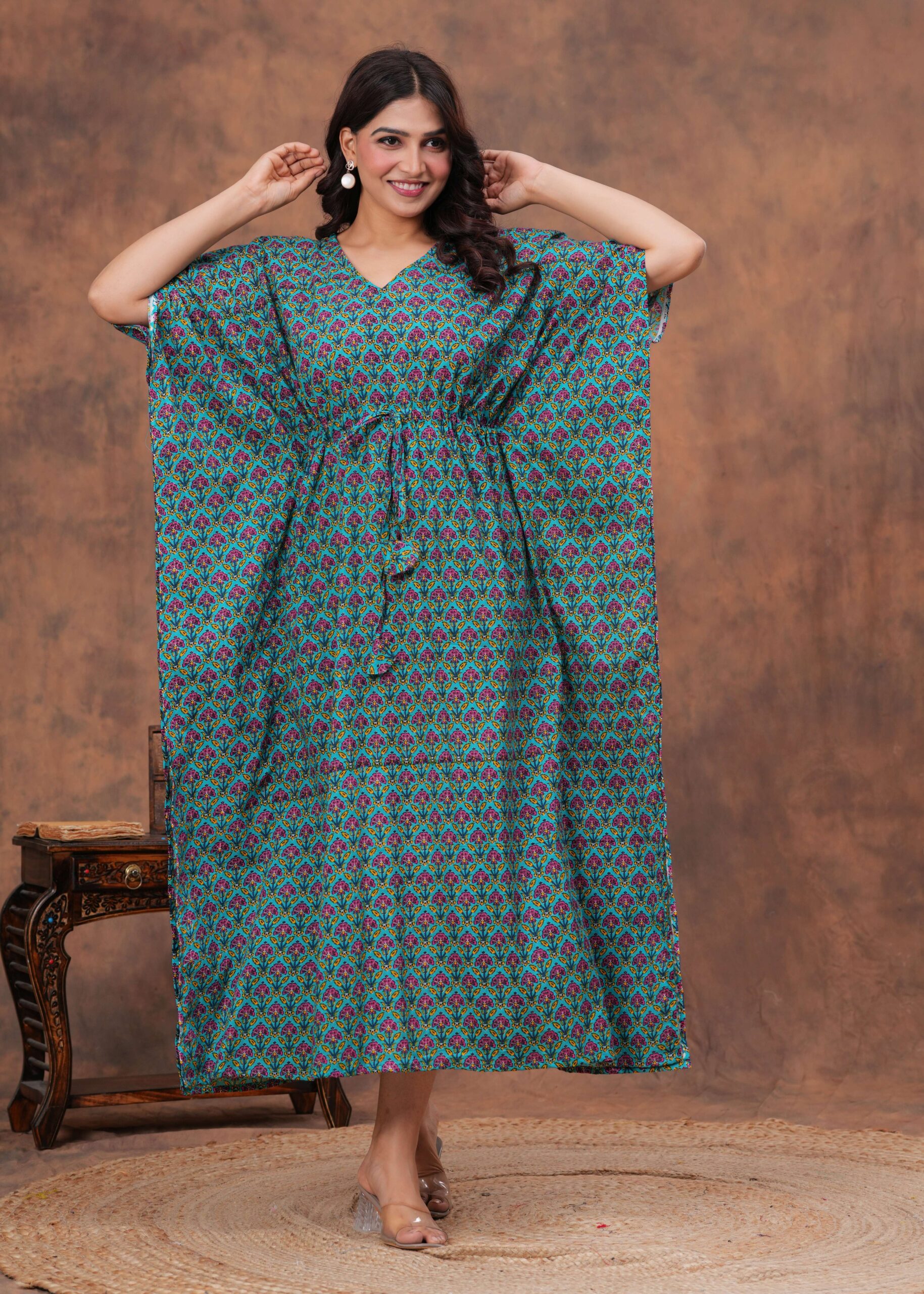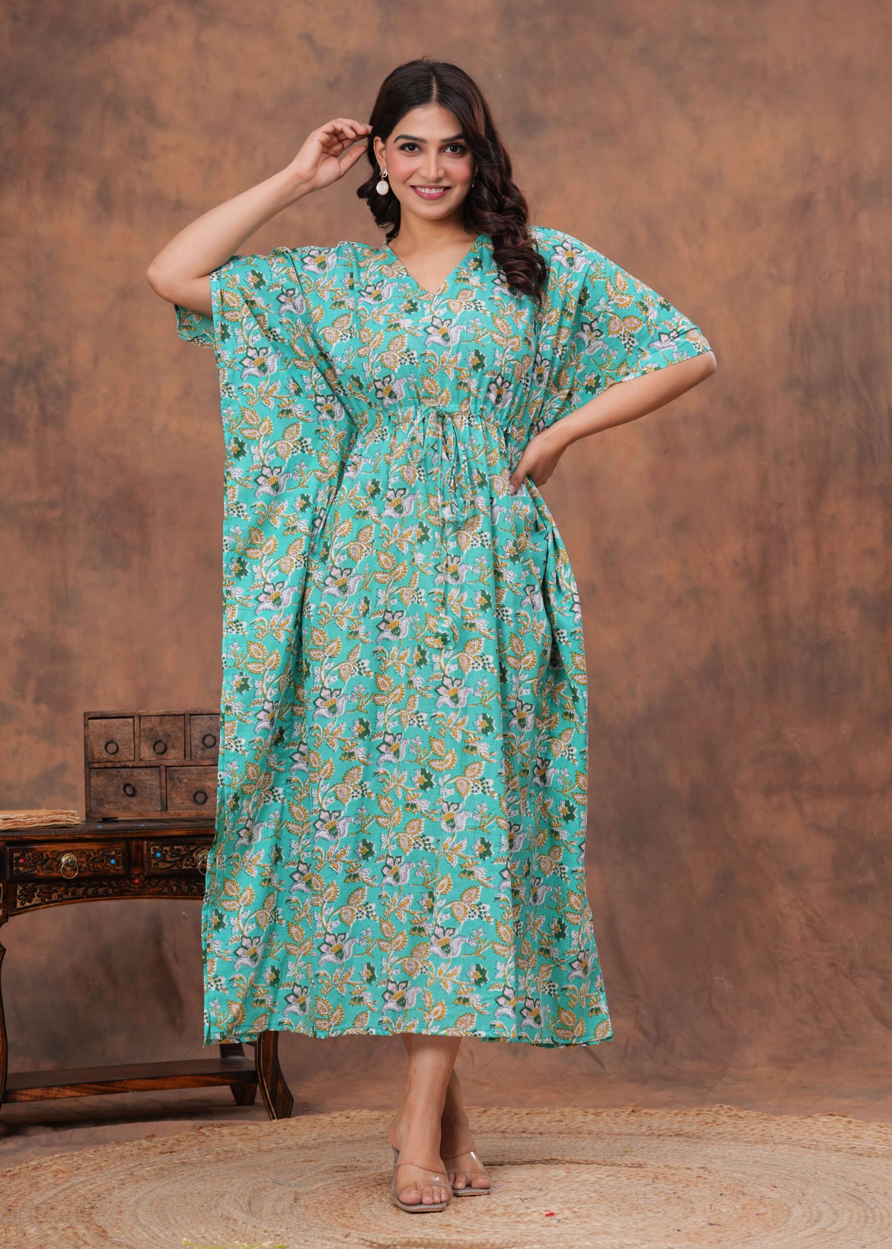 Women's Aqua Blue Cotton Floral Printed Kaftan Dress with Drawstring Waist
