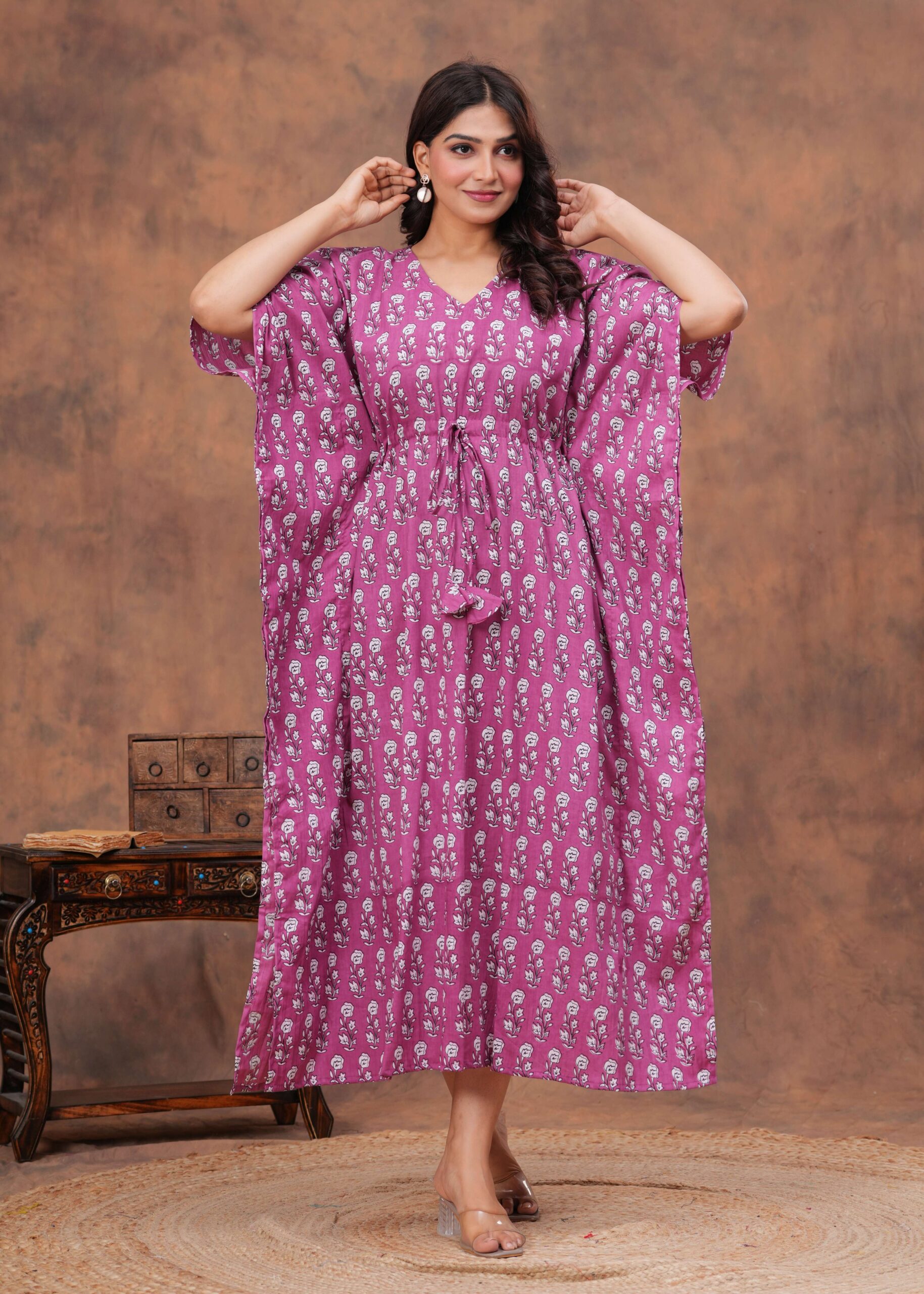 Women's Purple Blue Cotton Floral Printed Kaftan Dress with Drawstring Waist