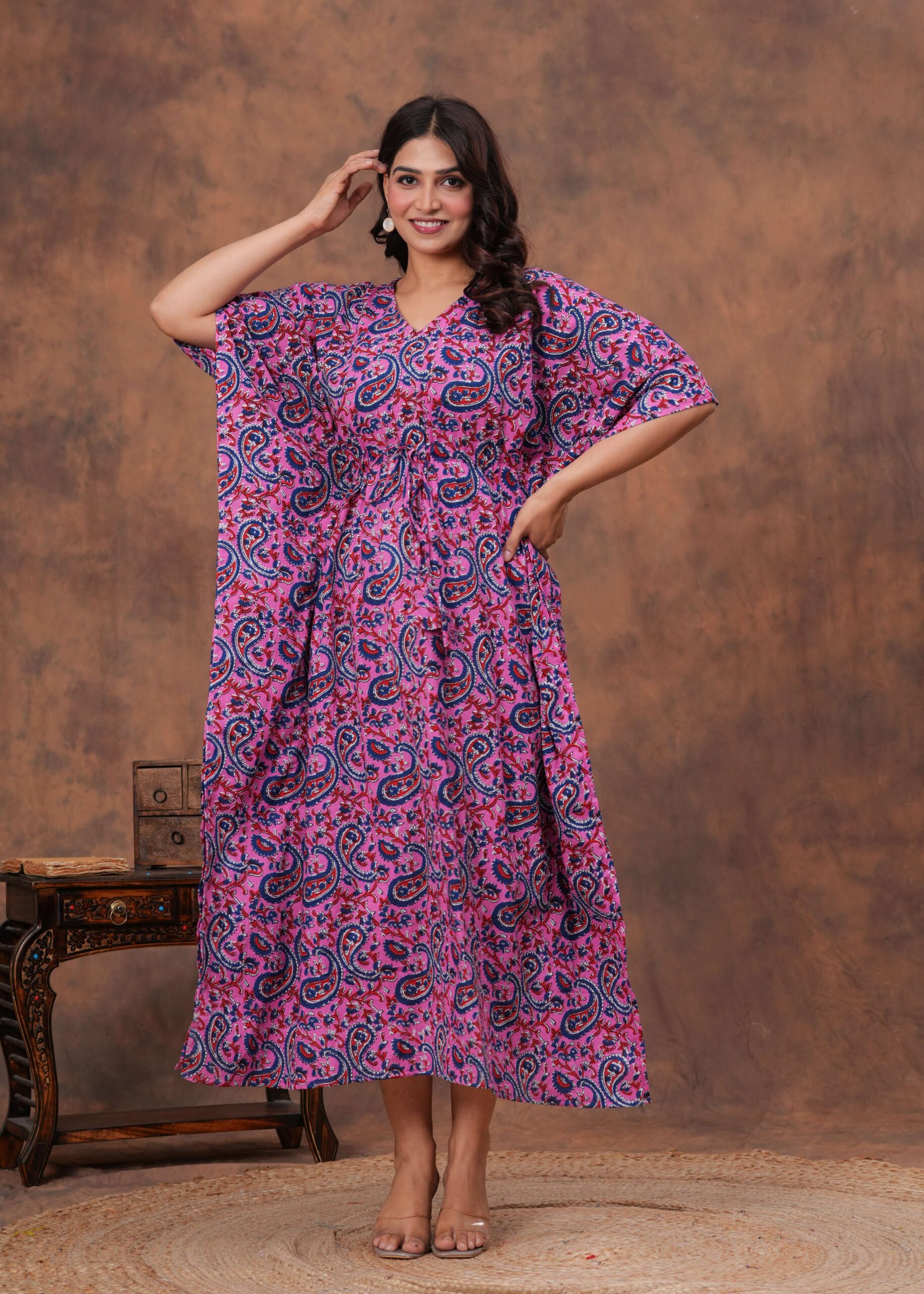 Women's Pink Cotton Floral Printed Kaftan Dress with Drawstring Waist