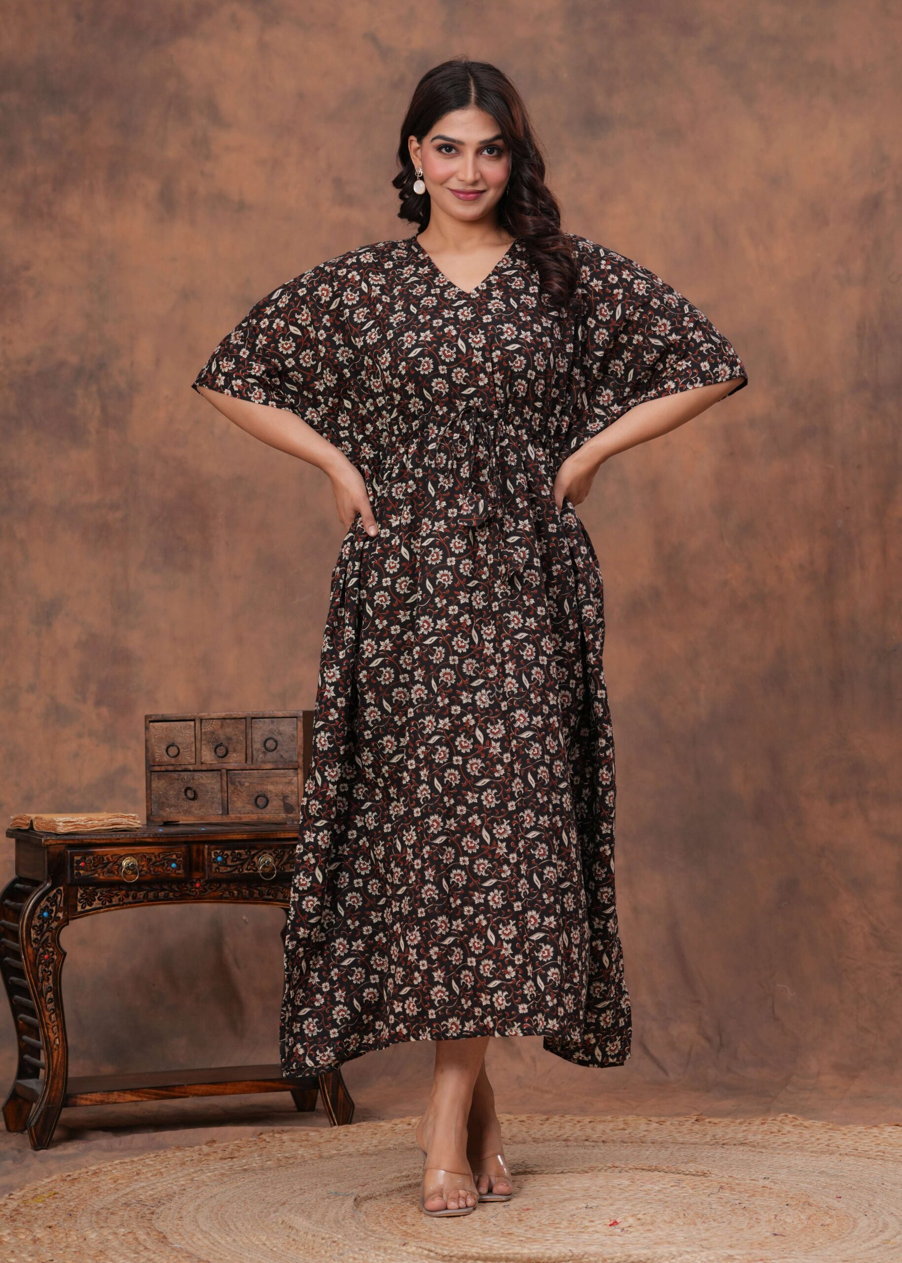Women's Black Cotton Floral Printed Kaftan Dress with Drawstring Waist