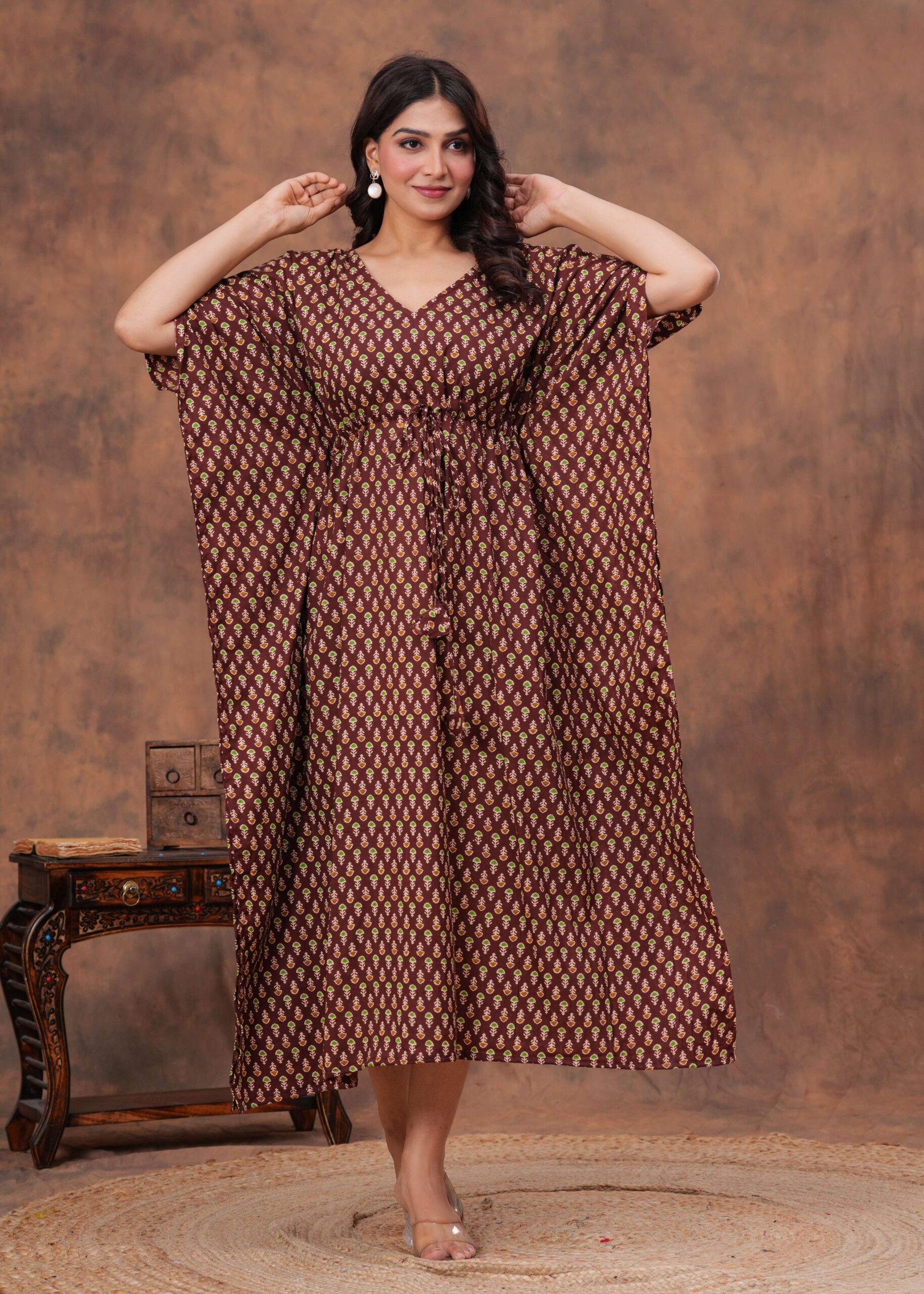 Women's Maroon Cotton Printed Kaftan Dress with Drawstring Waist