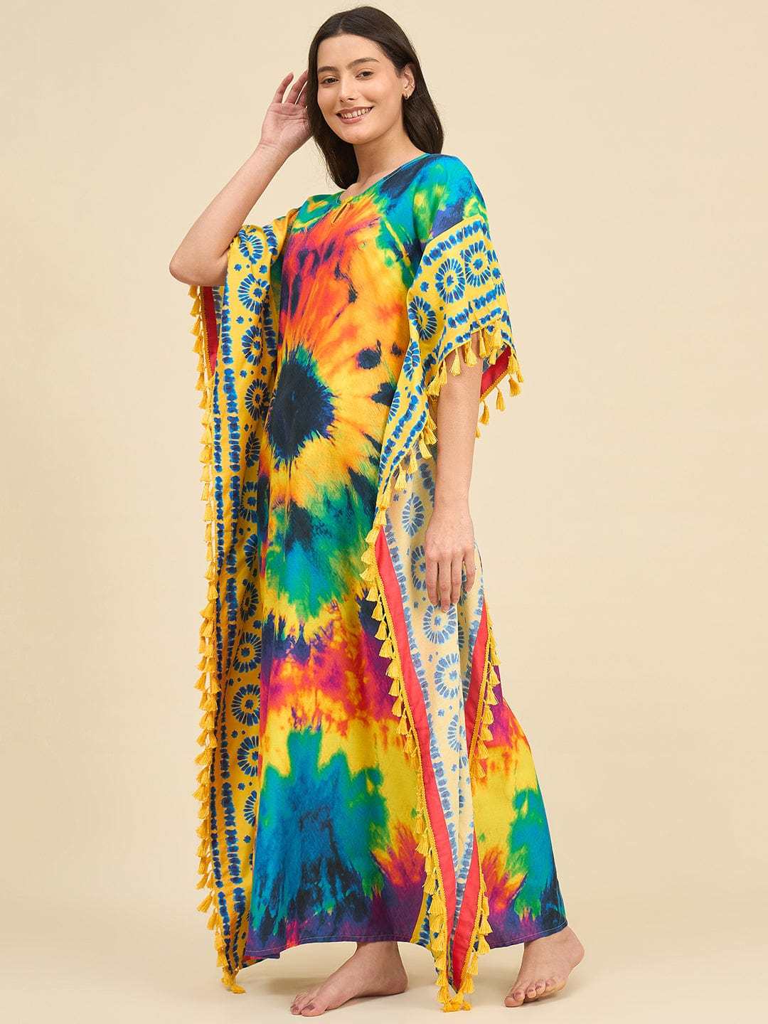 Women's Cotton Tie Dye Print Flowing Bell Sleeves Full Length Kaftan Drees Casual Beach Wear ( Multicolor )