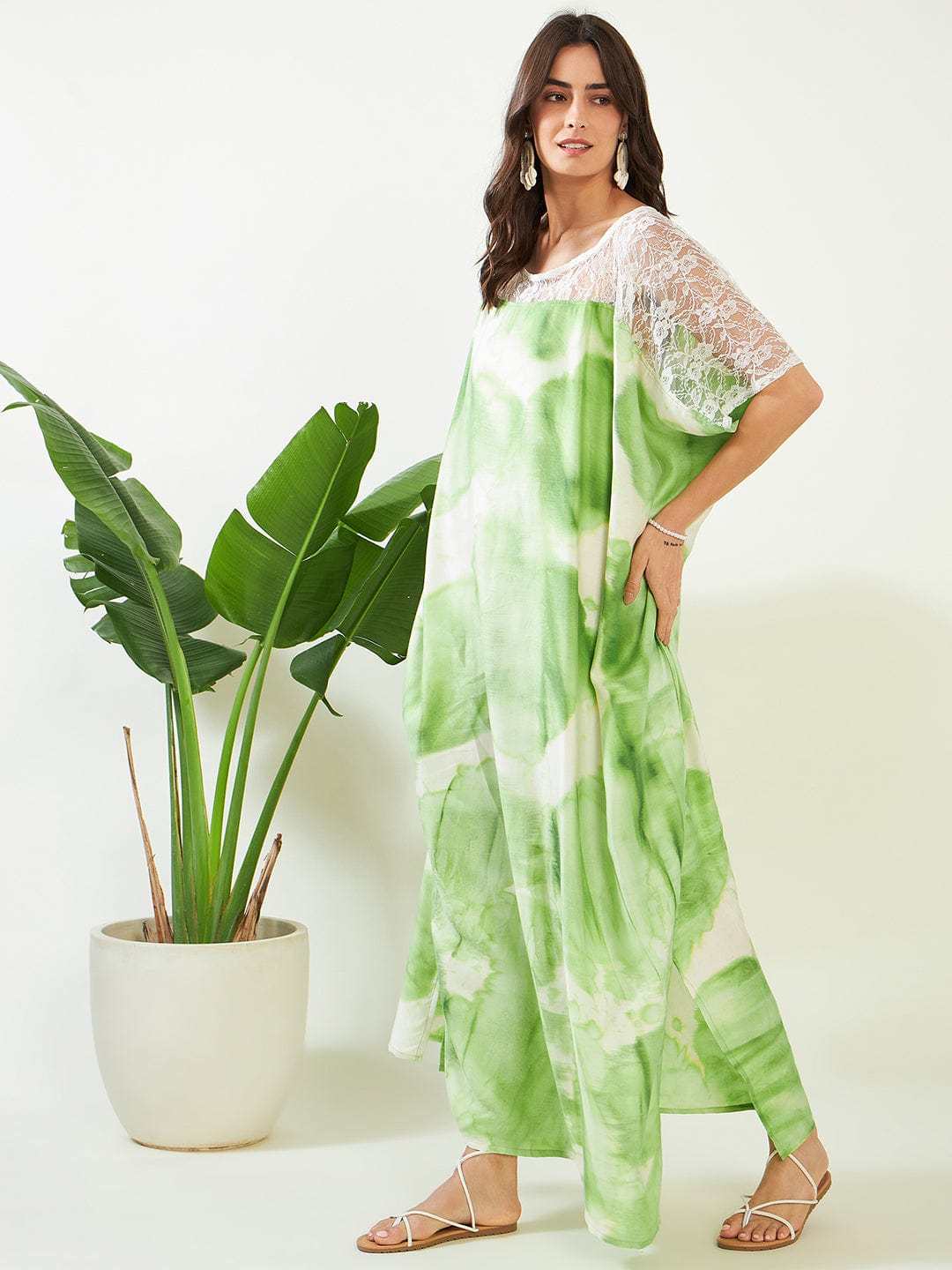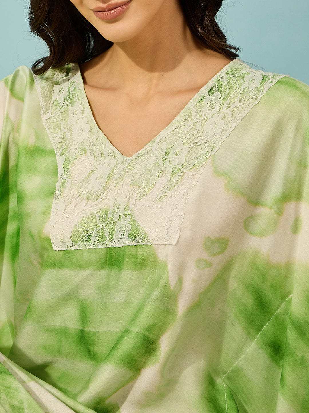 Women's Cotton Tie Dye Print Lace Trim, V-Neck, Full Length, Beach Casual Wear, Spring Collection Kaftan ( Green White )