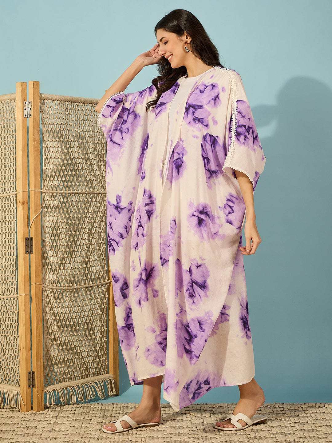 Women's Cotton Tie Dye Print Knee Length Kaftan Drees Beach Cover Up, Spring Casual Wear ( Purple White )