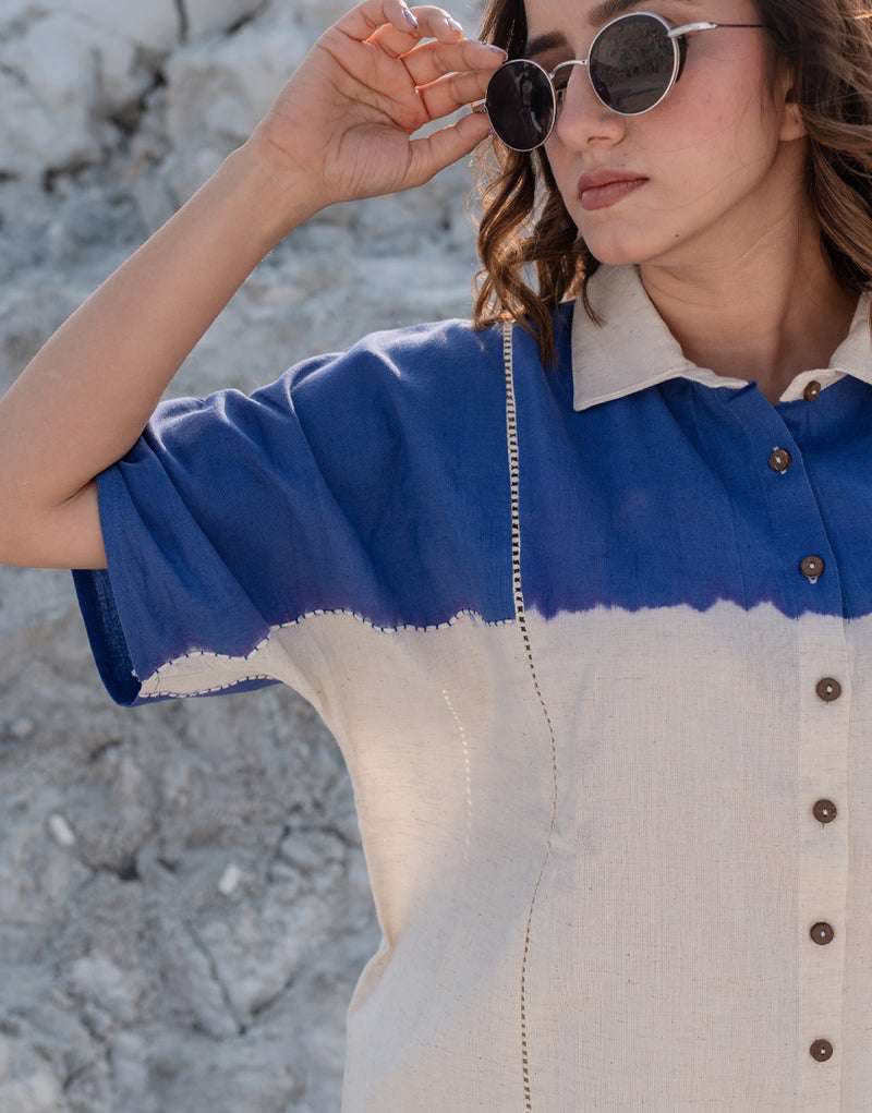 Women's Cotton Dip-Dye Pattern Two-Piece Lounge Set Tunic with Wide-Leg Pants, Resort Wear ( Navy Blue Beige )