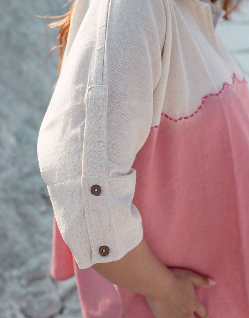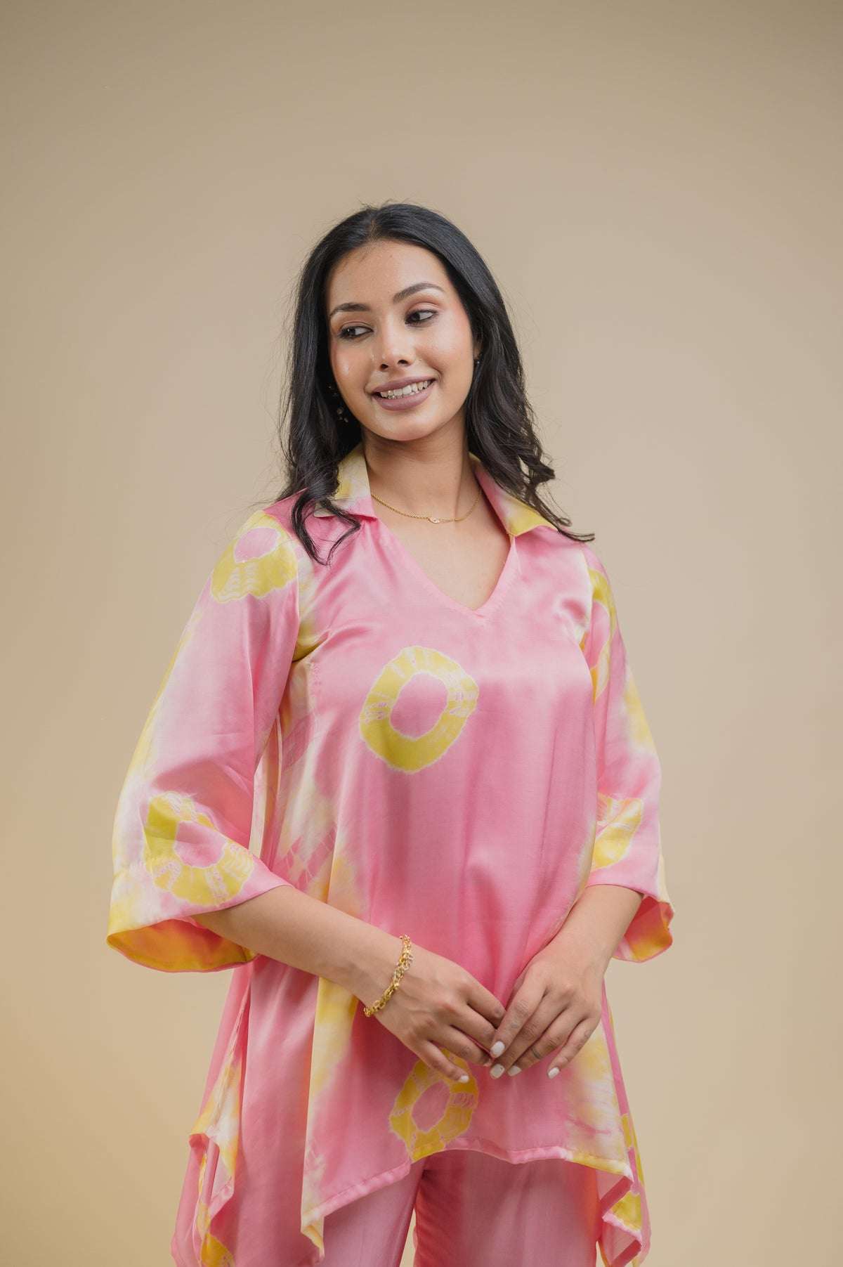Women's Cotton Tie Dye Print Two-Piece Lounge Set Button-Down Tunic with Palazzo Pants Resort Wear ( Pink )