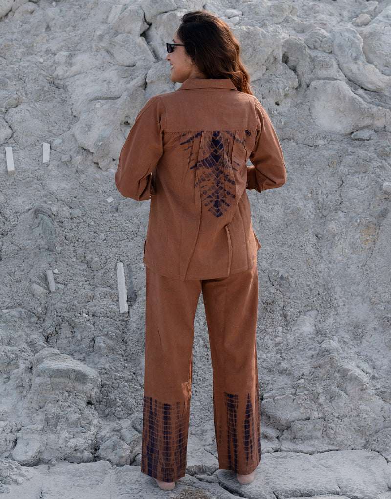 Women's Cotton Tie Dye Print Two-Piece Lounge Set Button-Down Tunic with Palazzo Pants Resort Wear ( Danim Brown )