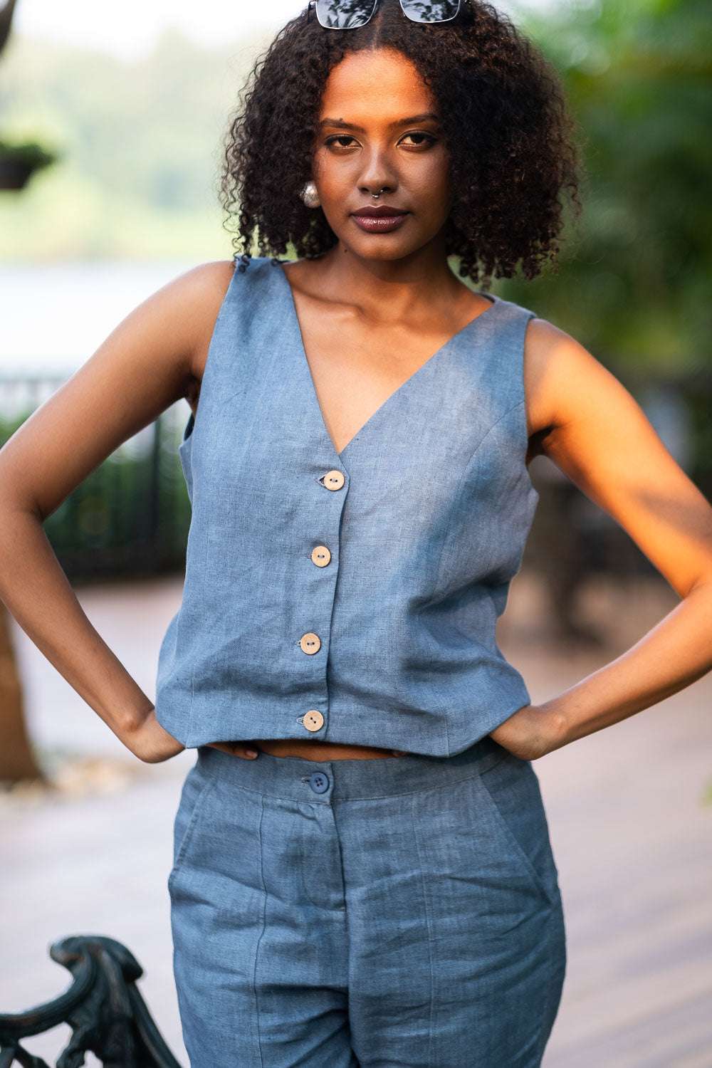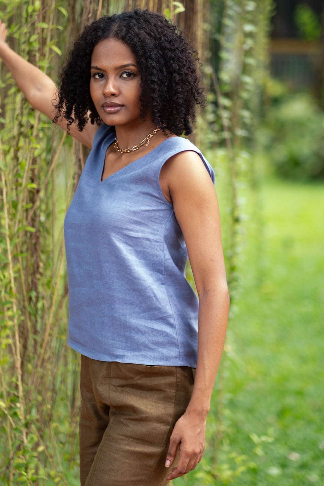 Women's Cotton Solid V Neck Sleeveless 2 Piece Outfit Loose Tank Top and Wide Leg Palazzo Pants Sets cord set ( Blue )