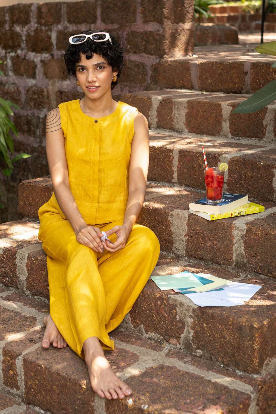Women's Cotton Solid V Neck Sleeveless 2 Piece Outfit Loose Tank Top and Wide Leg Palazzo Pants Sets cord set ( Golden )