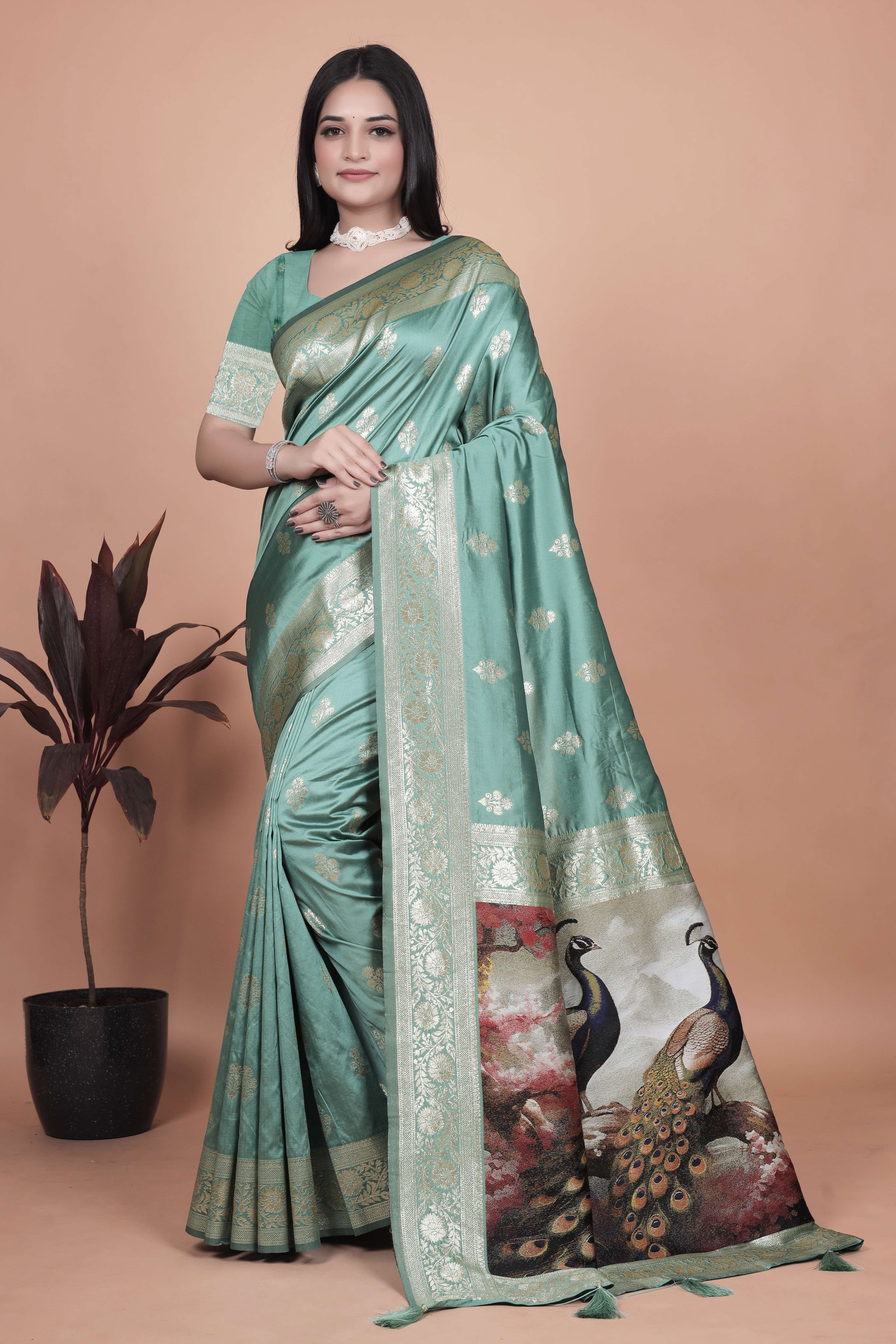 Elegant Sage Green Banarasi Silk Saree with Golden Zari Motifs & Peacock Pallu | Wedding, Festive & Traditional Wear