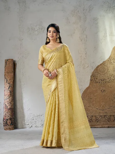 Beautiful Linen Saree in Yellow With Gold Zari Weaving and Blouse Designer