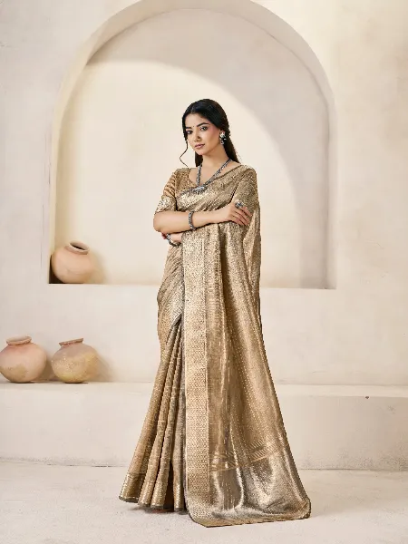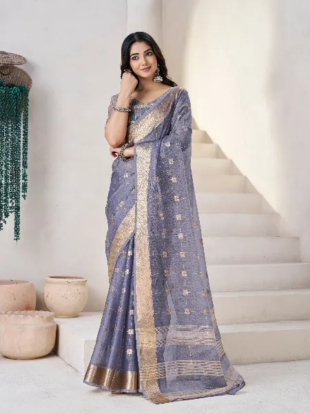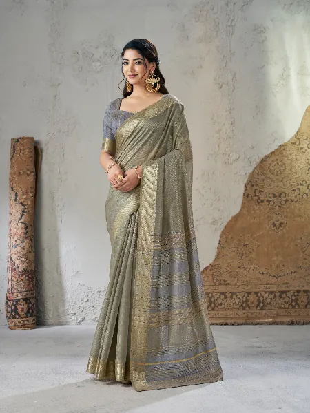 Beautiful Linen Saree in Grey With Gold Zari Weaving and Blouse Designer