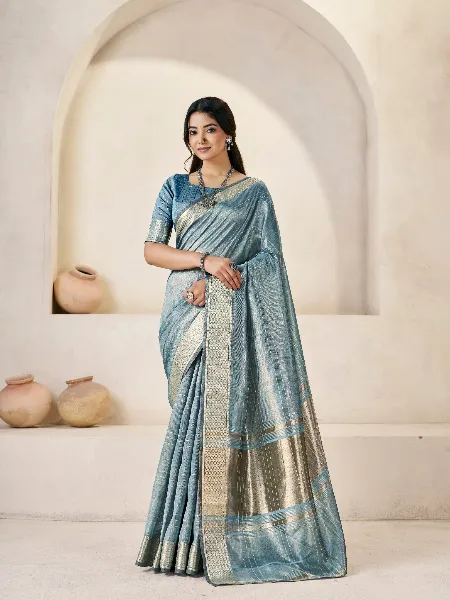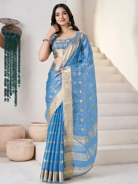 Elegant Linen Saree in Sky Blue With Gold Zari Weaving and Blouse