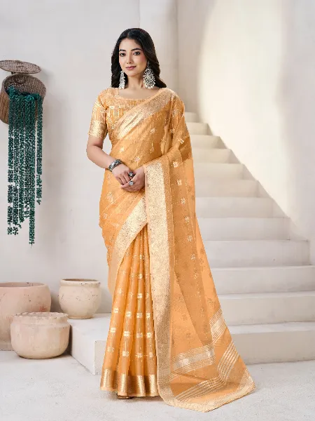 Beautiful Linen Saree in Orange With Gold Zari Weaving and Blouse Indian Traditional Saree
