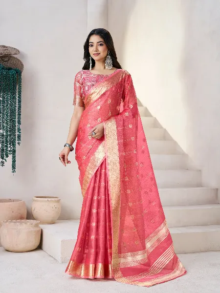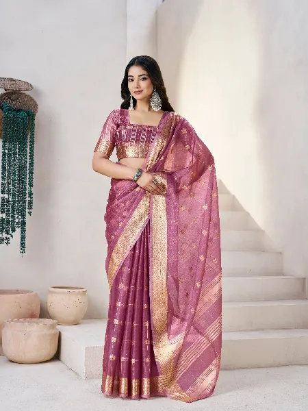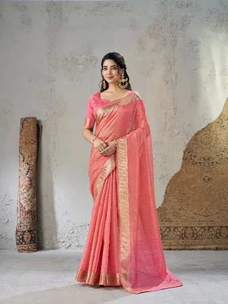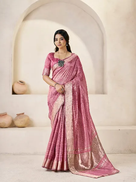 Beautiful Linen Saree in Pink With Gold Zari Weaving and Blouse Designer